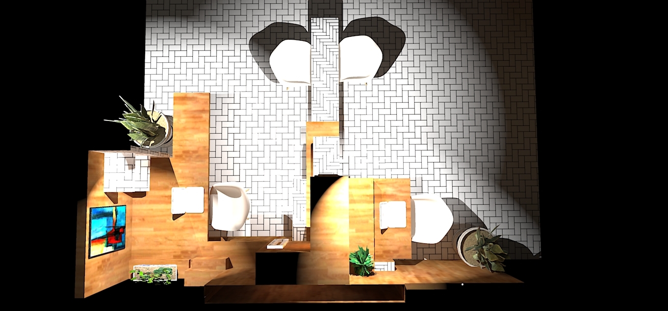 i’ve tried to steer clear of boring grey carpet tiles and have gone for a nice white and black herringbone pattern carpet which I have incorporated into the flooring as well as table tops and trims for contrast with the wood finish.